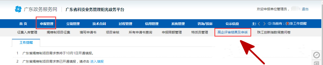 或者點擊“申報管理”然后選擇“高企評審結果及申述”