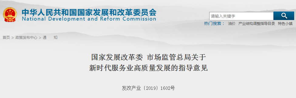 為深入貫徹黨的十九大精神,落實《中共中央、國務(wù)院關(guān)于推動高質(zhì)量發(fā)展的意見》要求,促進我國服務(wù)業(yè)高質(zhì)量發(fā)展,國家發(fā)展改革委、市場監(jiān)管總局制定《關(guān)于新時代服務(wù)業(yè)高質(zhì)量發(fā)展的指導(dǎo)意見》。指導(dǎo)意見突出宏觀統(tǒng)籌,圍繞制約服務(wù)業(yè)高質(zhì)量發(fā)展的薄弱環(huán)節(jié)和共性問題部署任務(wù),分行業(yè)高質(zhì)量發(fā)展由行業(yè)主管部門部署實施。