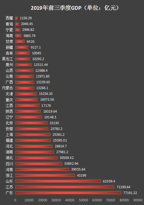 廣東前三季度GDP達(dá)77191.22億元,以絕對(duì)的優(yōu)勢(shì)位居榜首。數(shù)據(jù)顯示,2018年廣東全年GDP為97277.77億元,以目前的漲勢(shì)來(lái)看,廣東今年全年的GDP有望達(dá)到10萬(wàn)億元大關(guān)。