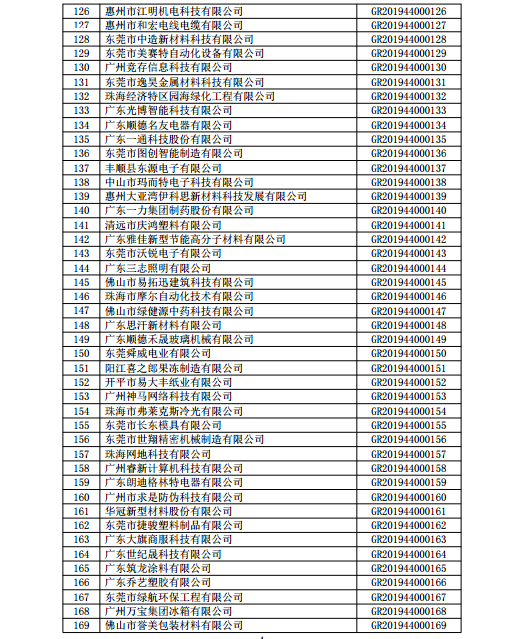 你們上報的《關于廣東省2019年高新技術企業認定備案的函》(粵科函高字〔2019〕1730號)收悉。現將公示無異議的東莞市英睿光電科技有限公司等3202家企業予以高新技術企業備案。請你們按照《廣東省2019年第一批高新技術企業名單》(詳見附件)中的企業名稱、高新技術企業證書編號和發證日期打印并頒發“高新技術企業證書”。