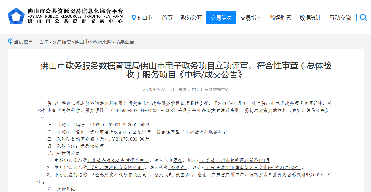 中檢賽辰技術服務有限公司(以下簡稱:賽辰)2020年4月22日以競爭性磋商方式優(yōu)勝其他同行競爭者,成功中標【佛山市某某局佛山市XX項目立項評審、符合性審查(總體驗收)服務項目】。
